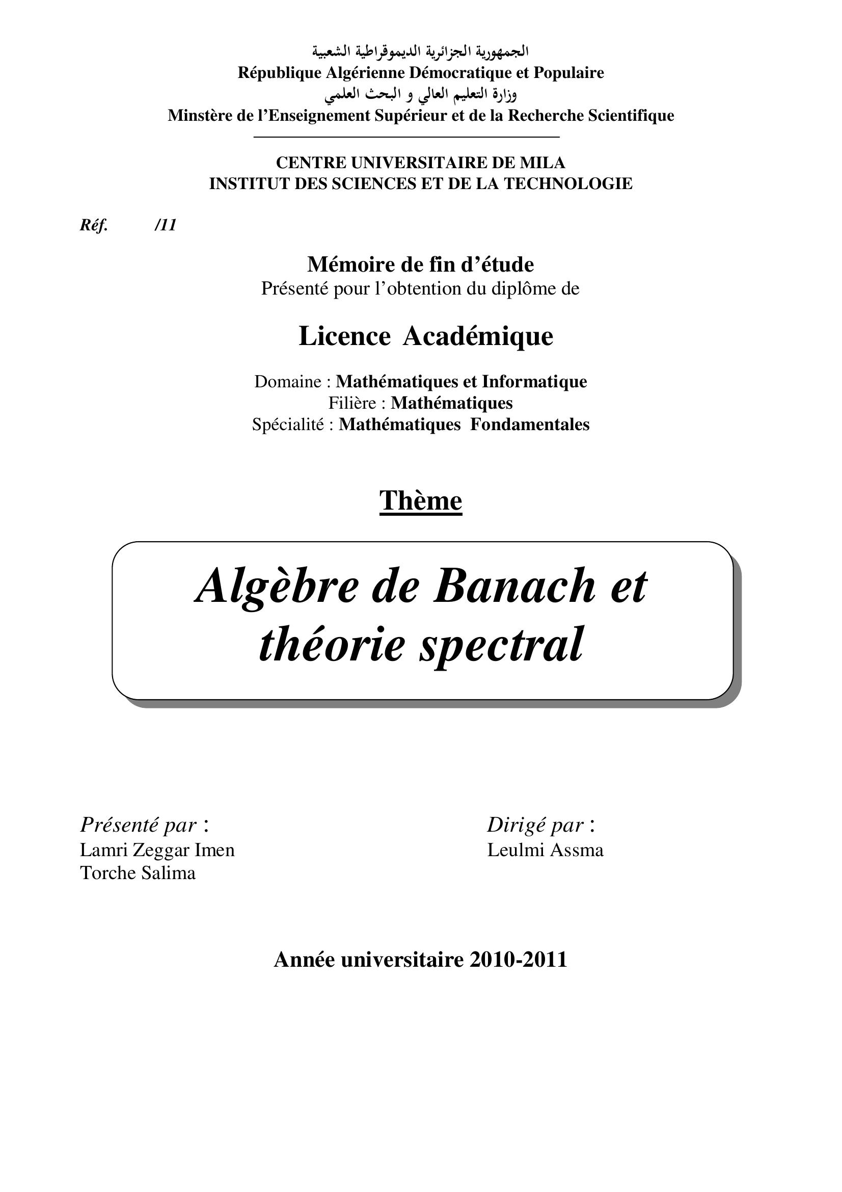 Lamir Zeggar Imen & Leulmi Assma encadreur (2011). Algèbre de banach et théorie spectral.