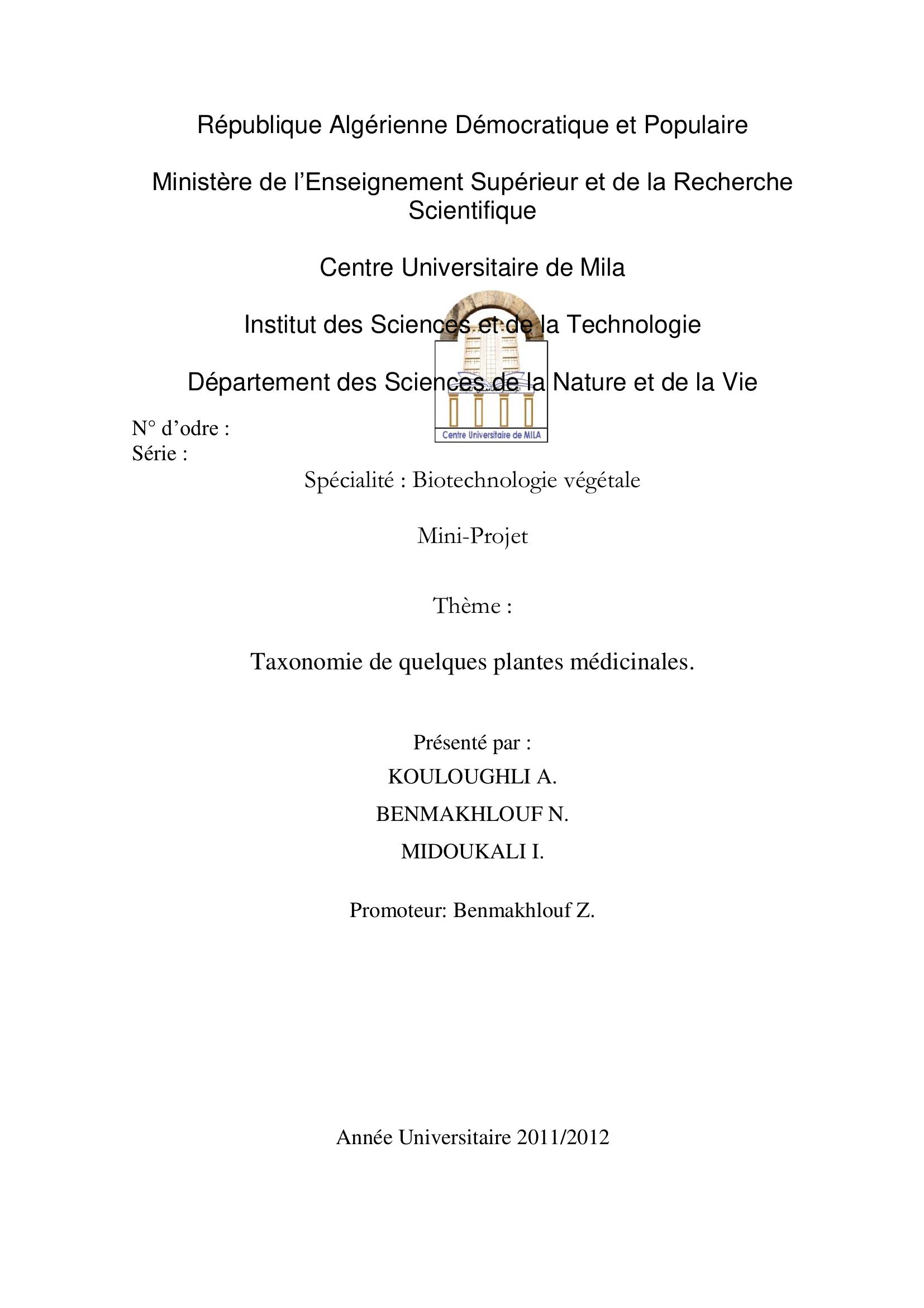 KOULOUGHLI aicha et al. (2012). Taxonomie de quelques plantes médicinales.