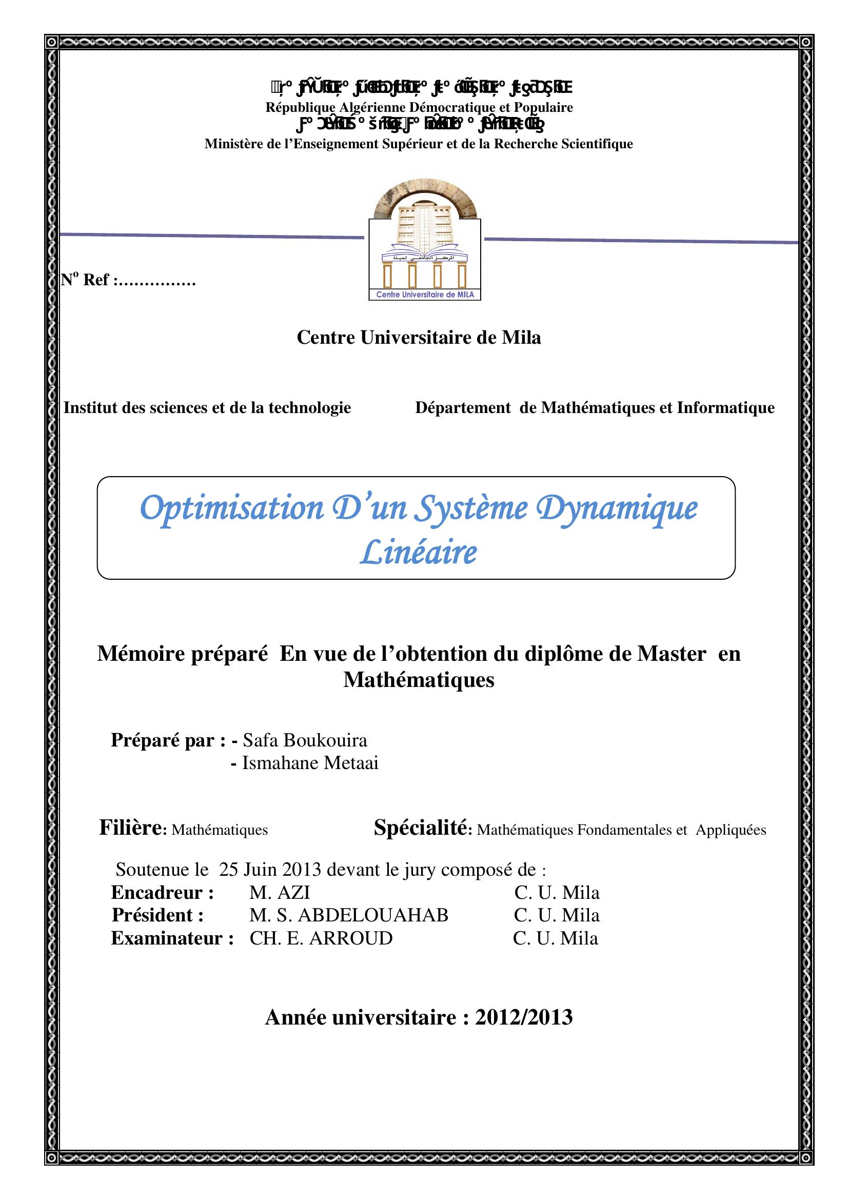 Safa Boukouira & M. AZI encadreur, M. (2013). Optimisation d'un système dynamique linéaire.