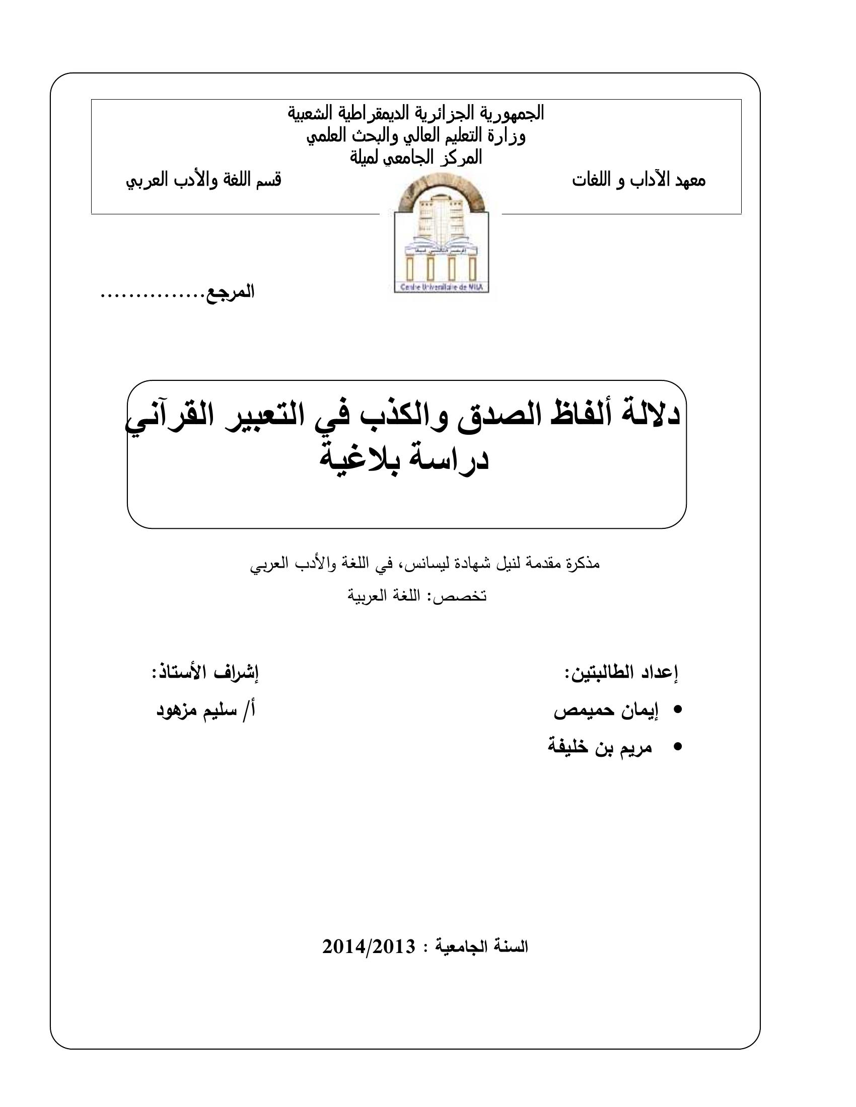حميمص إيمان et al. (2014). دلالة ألفاط الصدق والكذب في التعبير القرآني - دراسة بلاغية -.