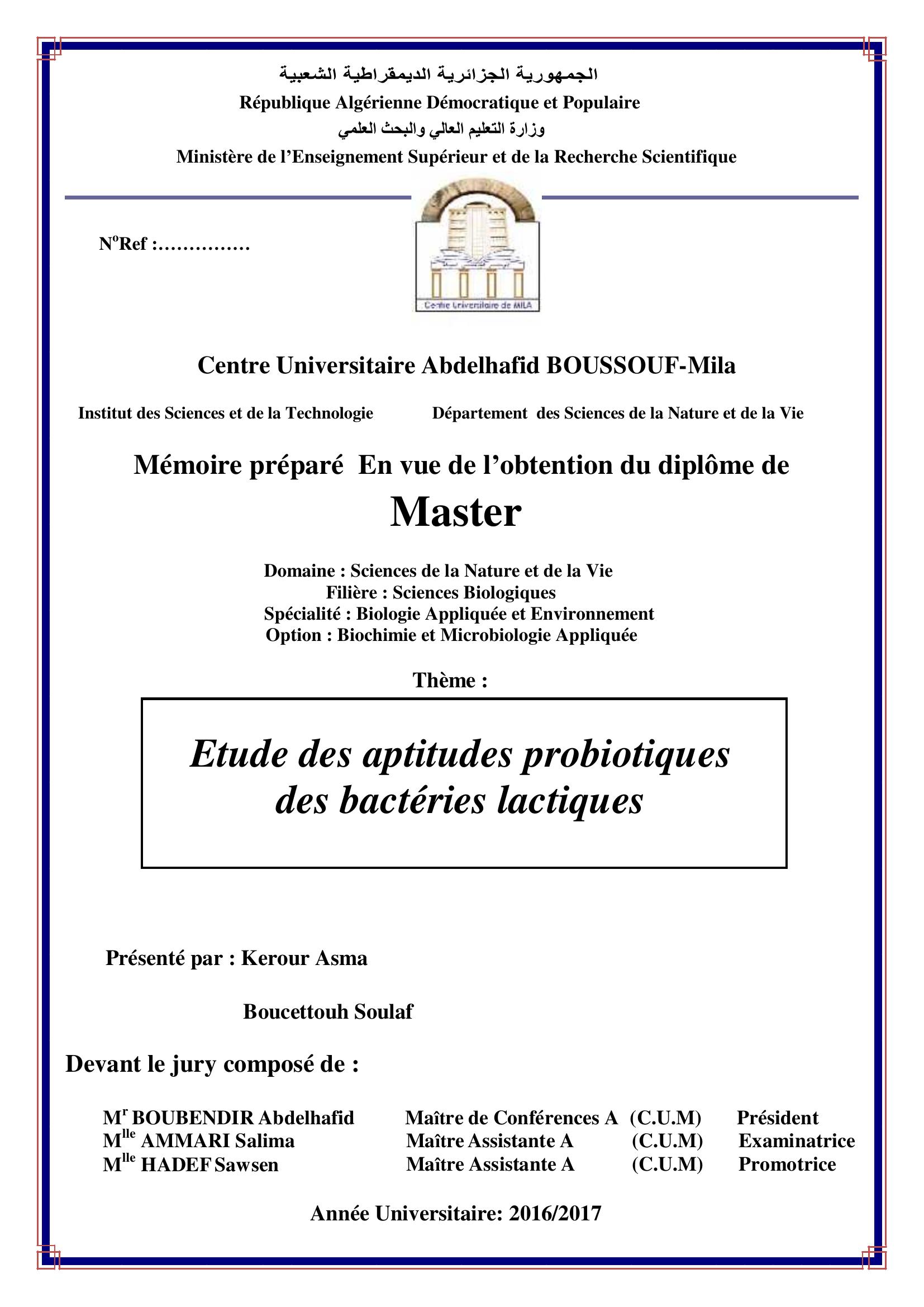 Kerour asma & BOUBENDIR Abdelhafid Président, A. (2017). Etude des aptitudes probiotiques des bactéries lactiques.