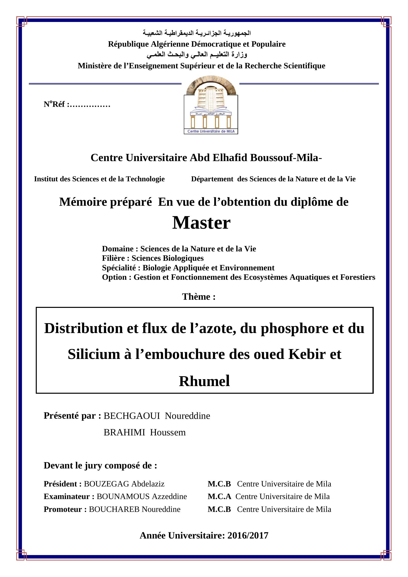 Bechgaoui noureddine & BOUZEGAG Abdelaziz Président, B. (2017). Distrubution et flux de l'azote , du phosphore et du silicium à l'embouchure d'oued kebir -rhumel.