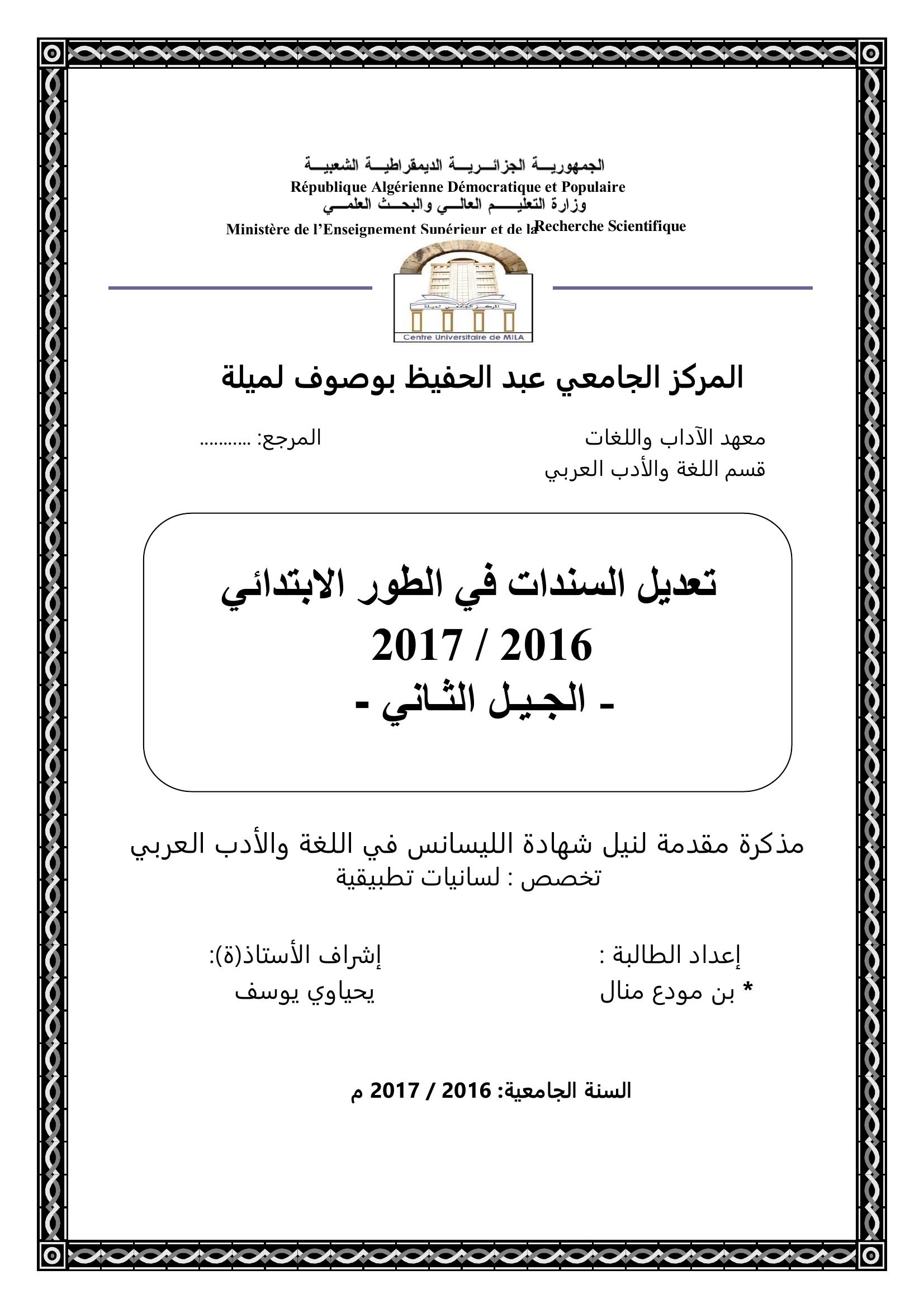 بن مودع منال & يحياوي يوسف (مشرفا) (2017). تعديل السندات في الطور الإبتدائي 2017/2016 الجيل الثاني.