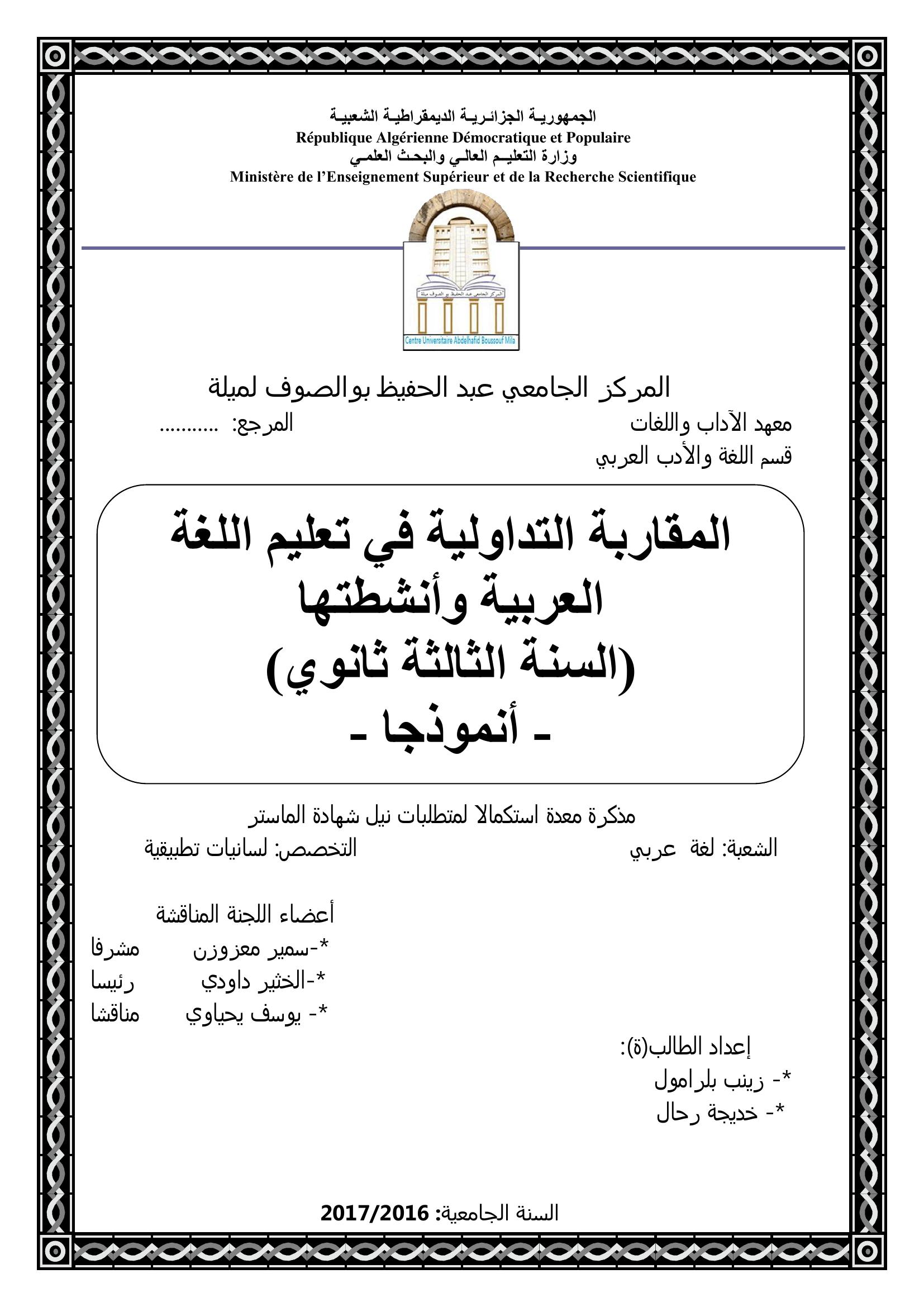 بلرامول زينب & معزوزن سمير (مشرفا) (2017). المقاربة التداولية في تعليم اللغة العربية وأنشطتها (السنة الثالثة ثانوي أنموذجا ).