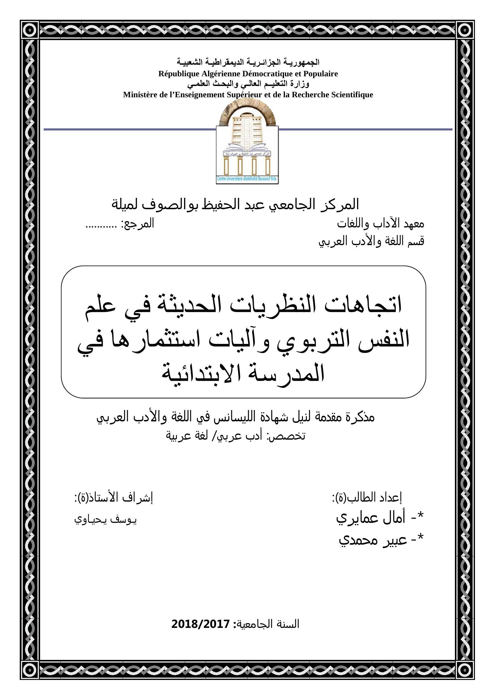 أمال عمايري & يوسف يحياوي( مشرفا) (2018). اتجاهات النظريات الحديثة في علم النفس التربوي وآليات استثمارها في المدرسة الابتدائية.