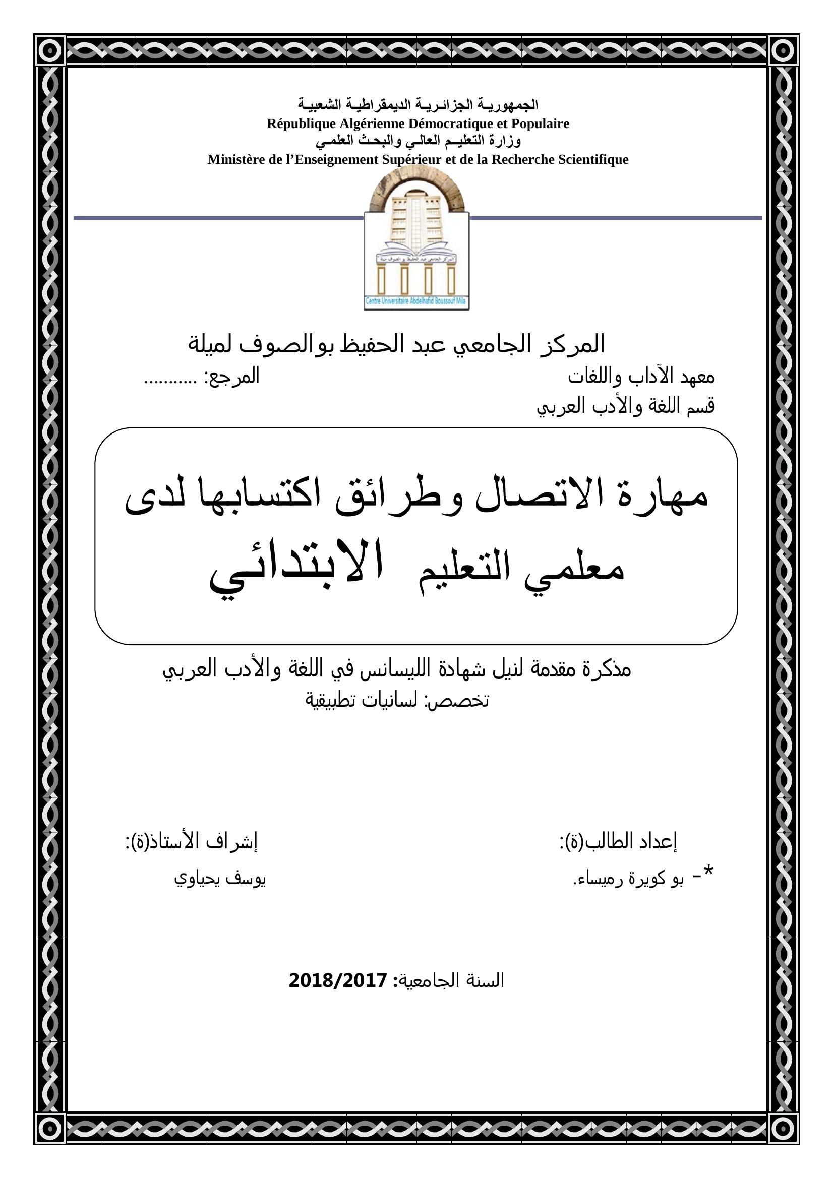 بو كويرة رميساء & يوسف يحياوي( مشرفا) (2018). مهارة الاتصال وطرائق اكتسابها لدى معلمي التعليم الابتدائي.