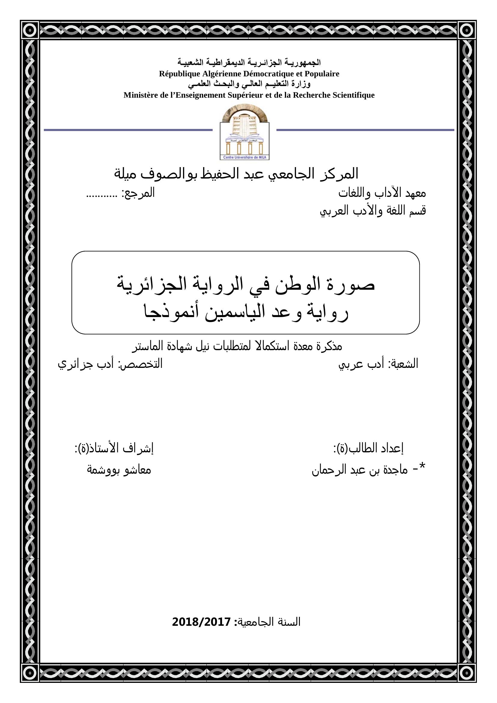بن عبد الرحمان ماجدة & معاشو بوشمة (مشرفا) (2018). صورة الوطن في الرواية الجزائرية رواية وعد الياسمين أنموذجا.