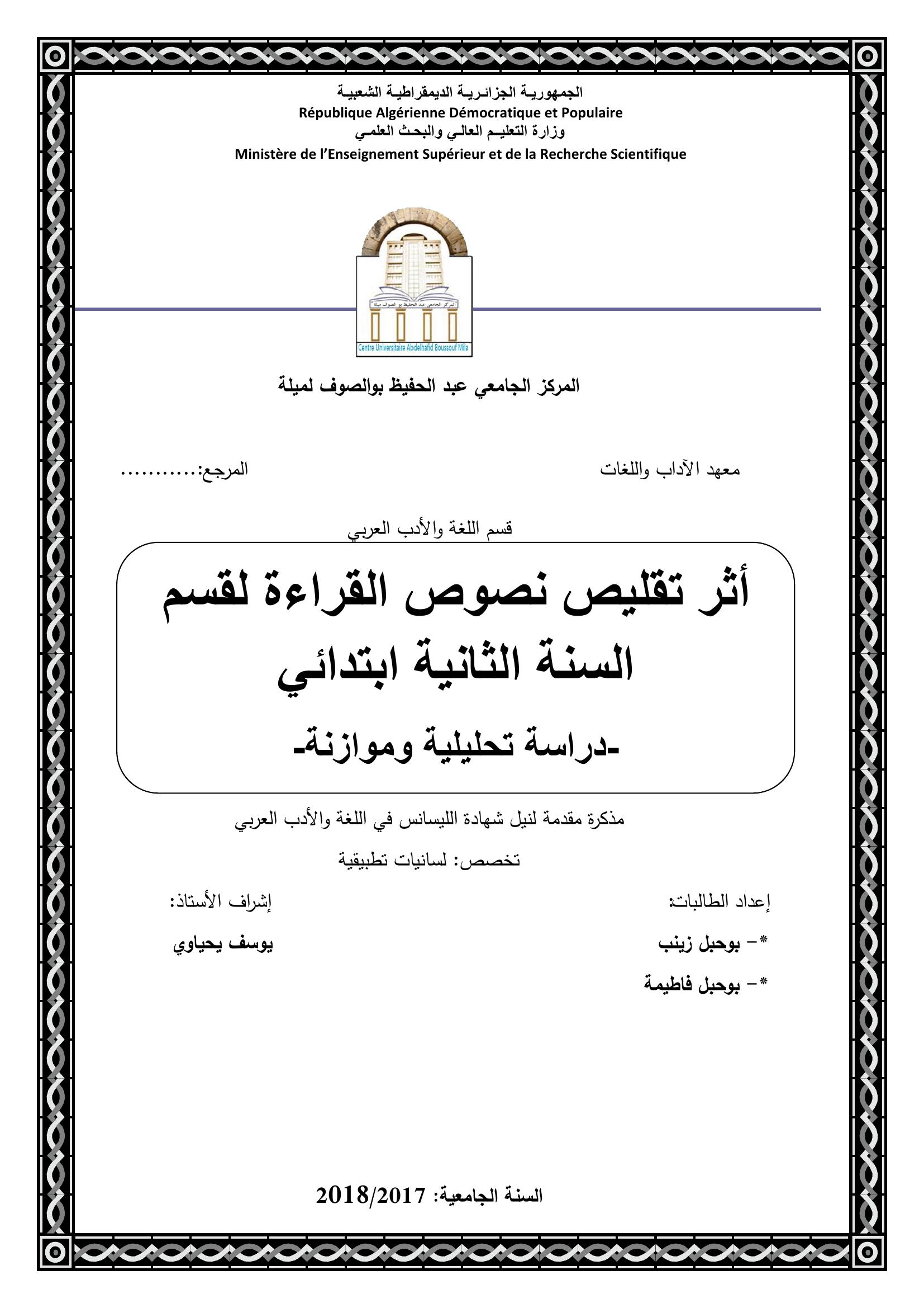 بوحبل زينب & يوسف يحياوي( مشرفا) (2018). أثر تقليص نصوص القراءة لقسم السنة الثانية ابتدائي : -دراسة تحليلية وموازنة-.