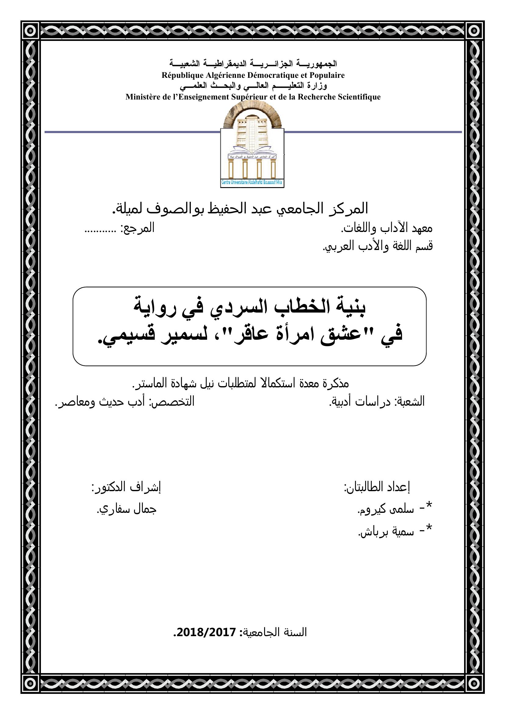 كيروم سلمى & سفاري جمال (مشرفا) (2018). بنية الخطاب السردي في رواية في عشق إمرأة عاقر لسمير قسيمي.