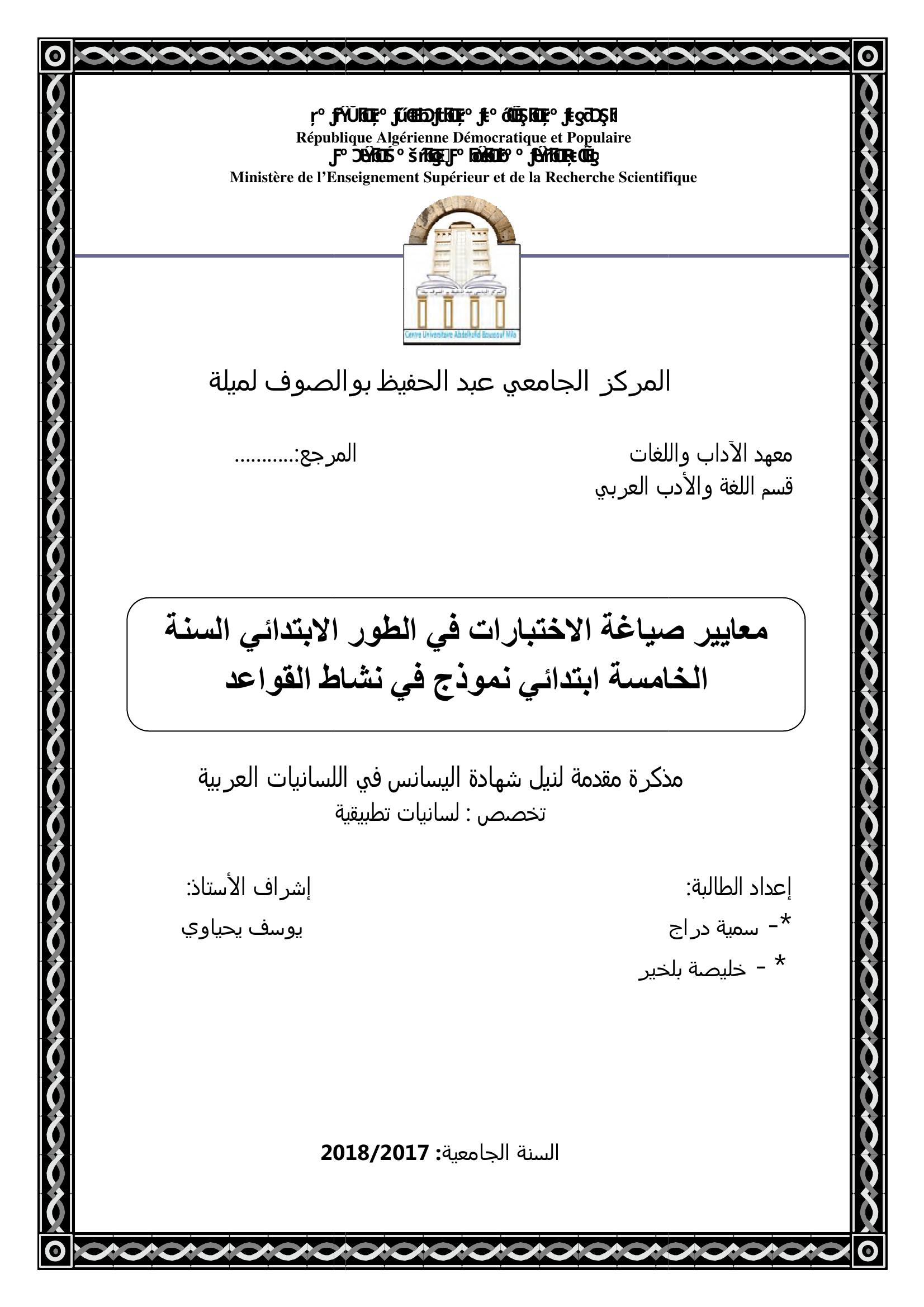 سمية دراج & يوسف يحياوي( مشرفا) (2018). معايير صياغة الاختبارات في الطور الابتدائي السنة الخامسة ابتدائي نموذج في نشاط القواعد.