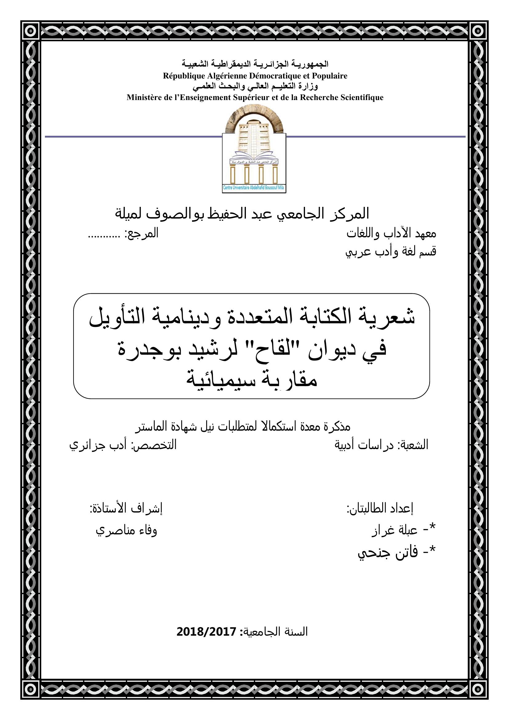 غراز عبلة & مناصري وفاء (مشرفا) (2018). شعرية الكتابة المتعددة ودينامية التأويل في ديوان لقاح لرشيد بوجدرة مقاربة سيميائية.