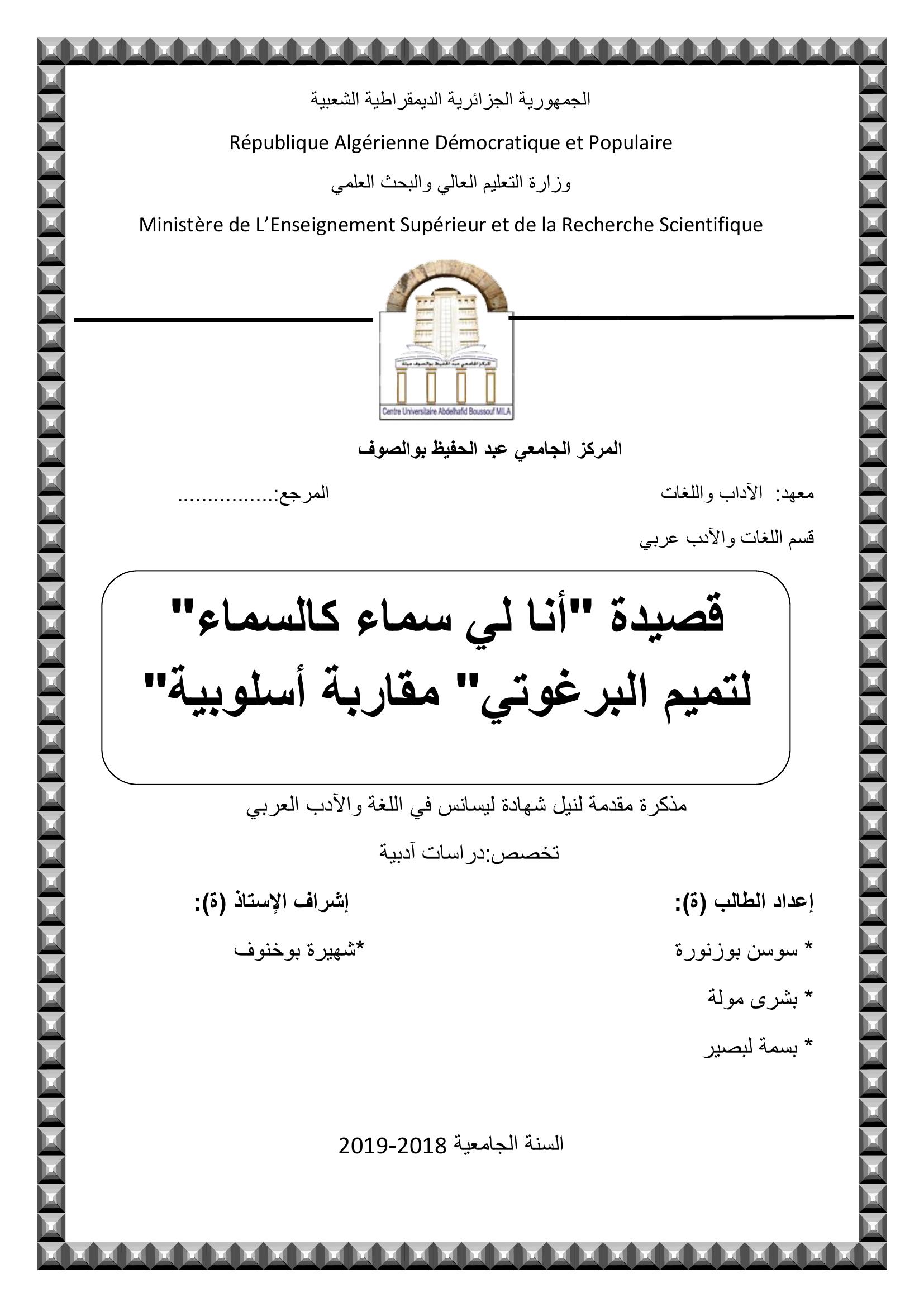 بوزنورة سوسن & بوخنوف شهيرة (مشرفا) (2019). قصيدة "أنا لي سماء كالسماء" لتميم البرغوتي - مقاربة أسلوبية-.