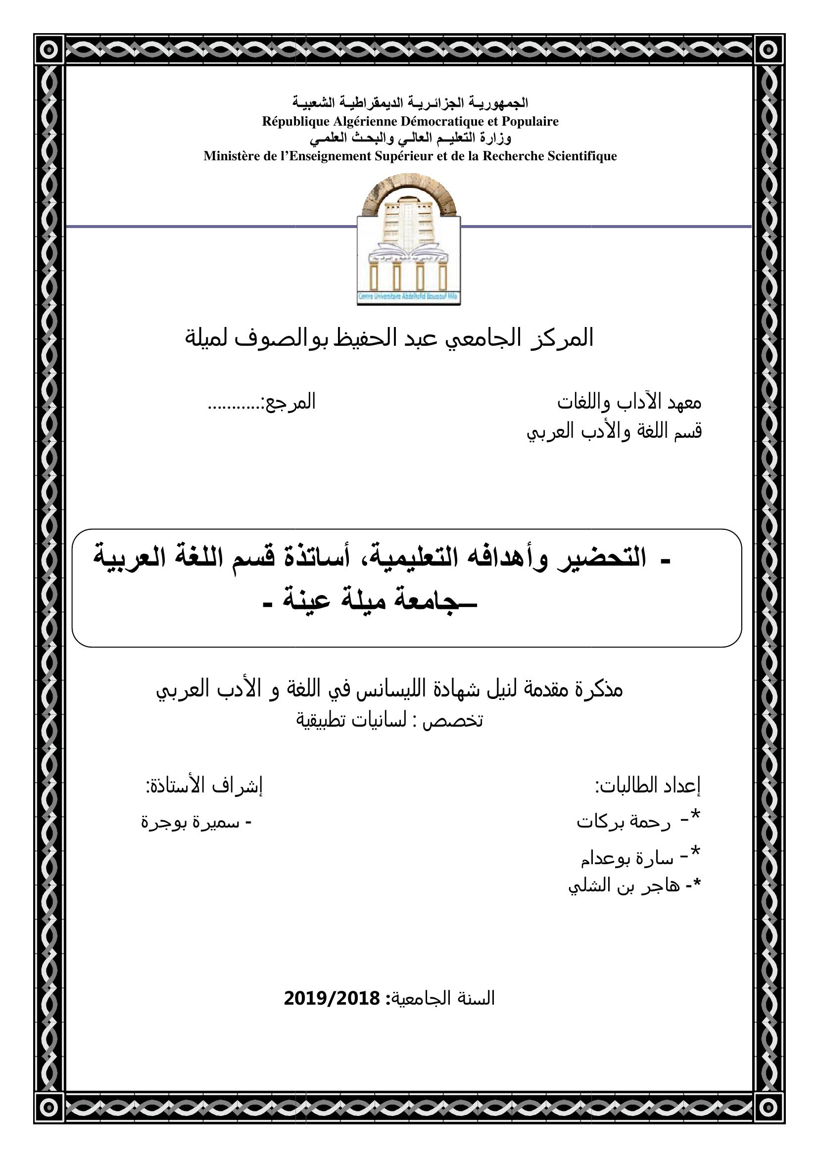 بركات رحمة & بوجرة سميرة (مشرفا) (2019). التحضير وأهدافه التعليمية - اساتدة قسم اللغة العربية جامعة ميلة عينة.