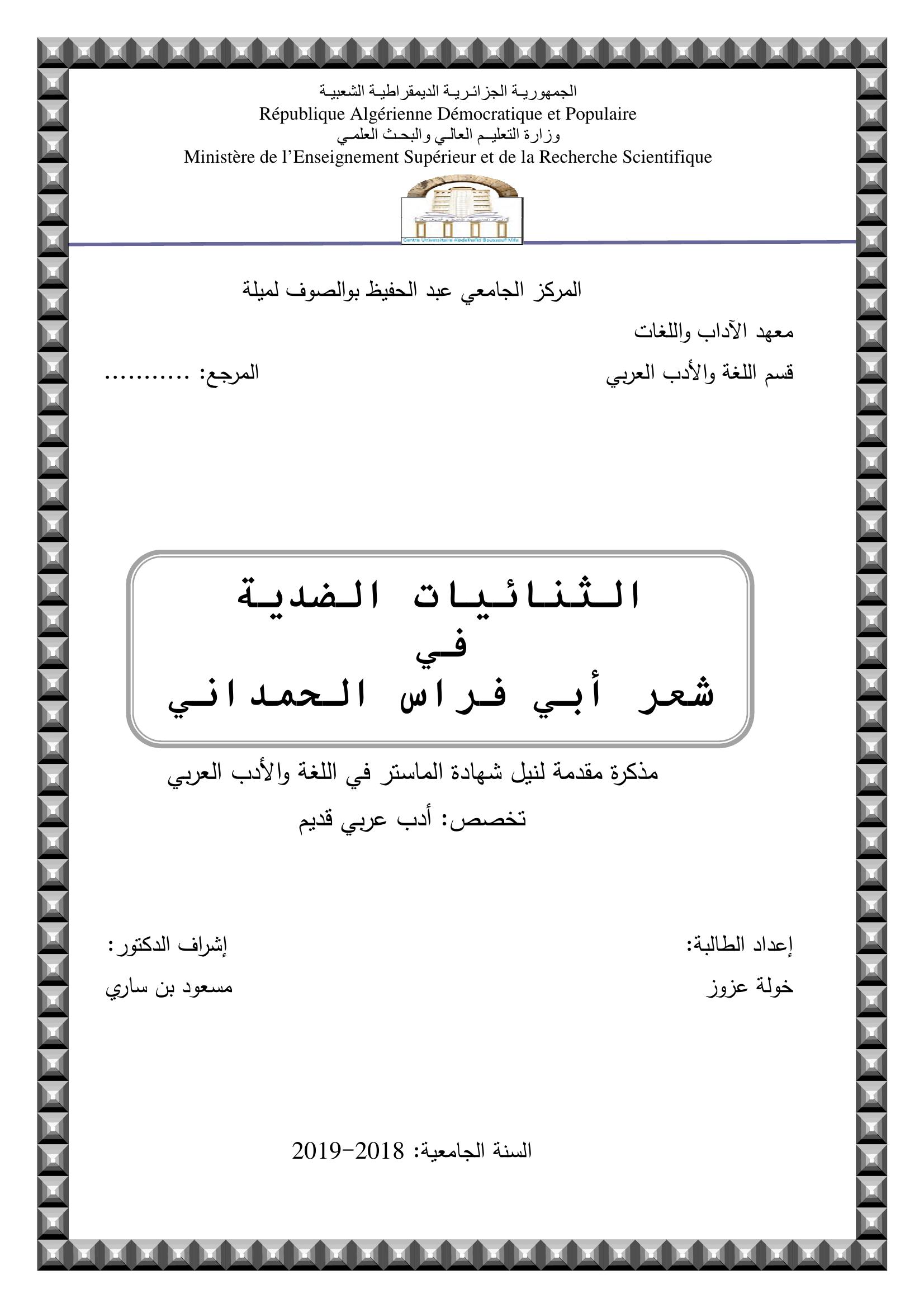 عزوز خولة & بن ساري مسعود(مشرفا) (2019). الثنائيات الضدية في شعر ابي الفراس الحمداني.