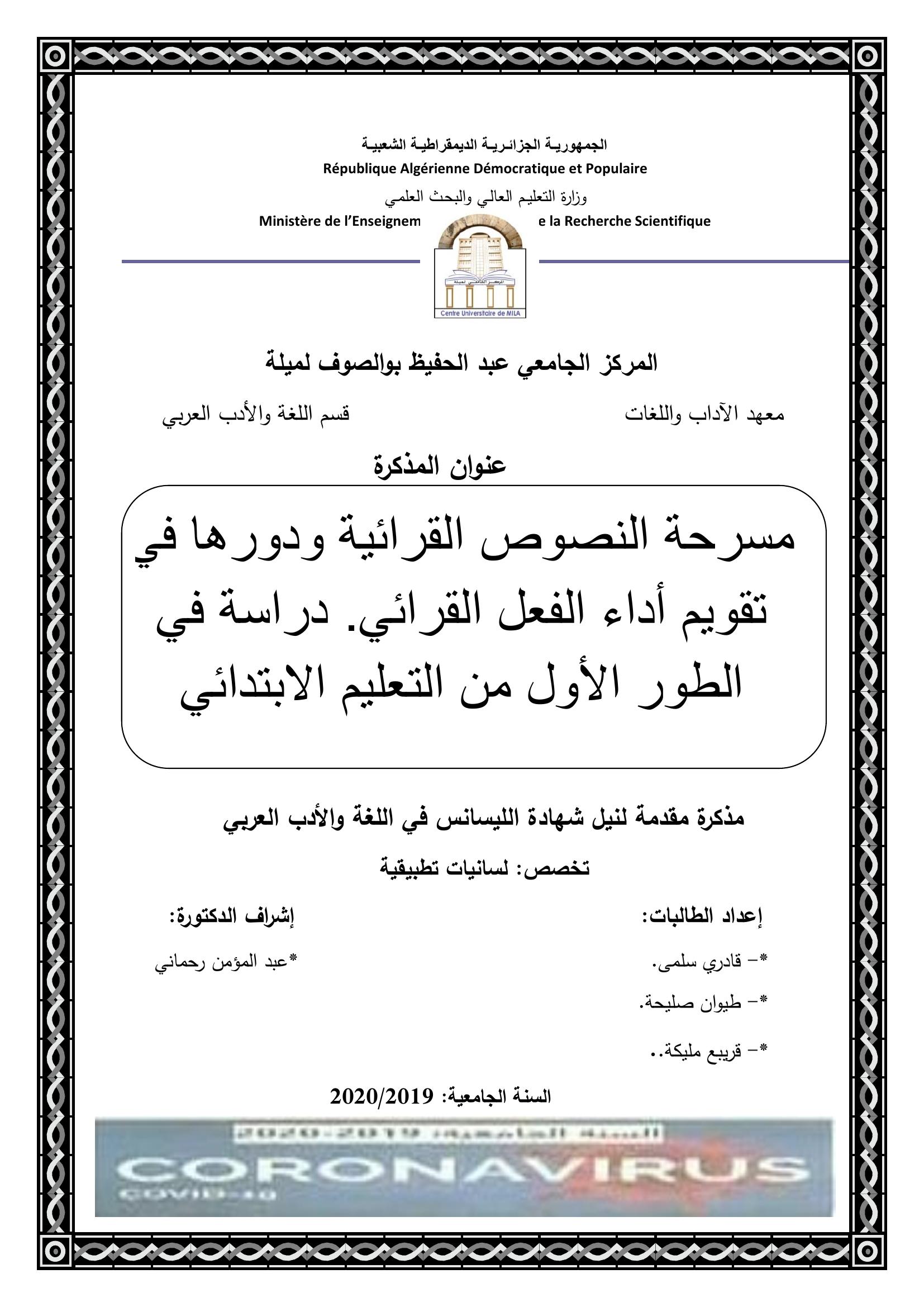 قادري سلمى et al. (2020). مسرحة النصوص القرآنية و دورها في تقويم أداء المتعلم القرآني دراسة في الطور الأول من التعليم الإبتدائي.
