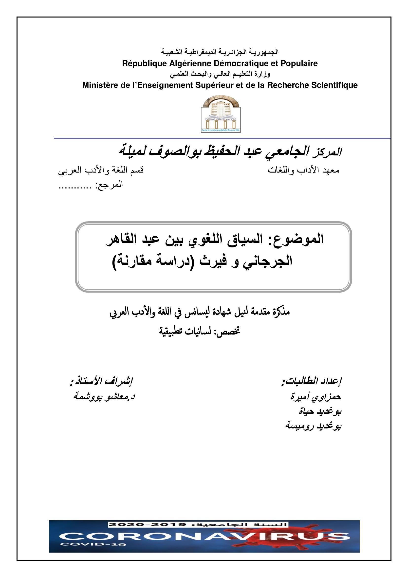 بوغديد حياة et al. (2020). السياق اللغوي بين عبد القاهر الجرجاني وفيرث -دراسة مقارنة-.