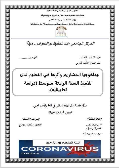 مريخي مريم et al. (2021). بيداغوجيا المشاريع وأثرها في التعليم لدى تلاميذ السنة الرابعة متوسط -دراسة تطبيقية (ليسانس- ل م د) . المركز الجامعي عبد الحفيظ بوالصوف ميلة.