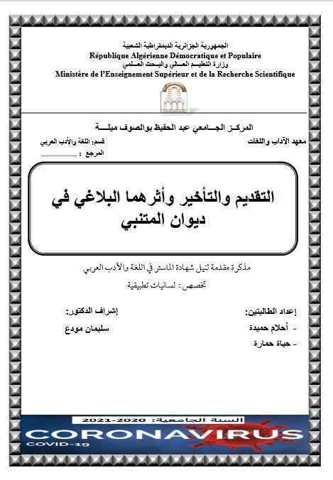 حمارة حياة et al. (2021). التقديم والتاخير واثرهما البلاغي في ديوان المتنبي (ماستر- ل م د) . المركز الجامعي عبد الحفيظ بوالصوف ميلة.