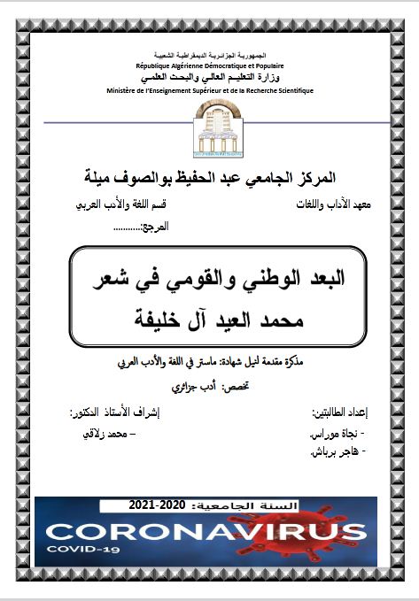 برباش هاجر et al. (2021). البعد الوطني والقومي في شعر محمد العيد آل خليفة (ماستر- ل م د) . المركز الجامعي عبد الحفيظ بوالصوف ميلة.