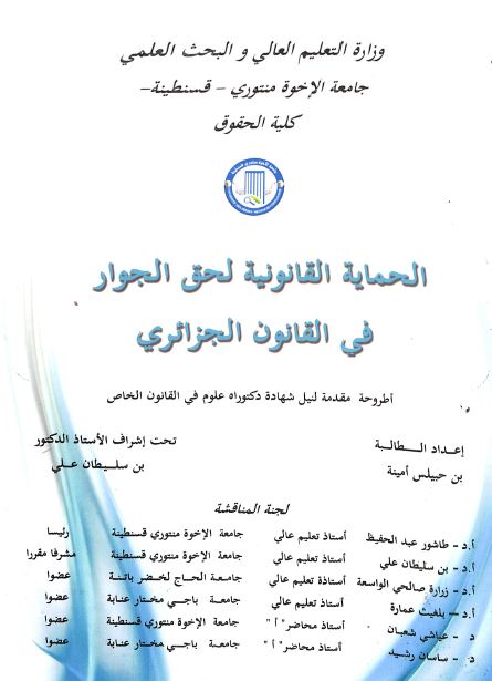 بن حبيلس أمينة & بن سليطان علي (مشرفا ومقررا) (2017). الحماية القانونية لحق الجوار في القانون الجزائري (دكتوراه) . قسنطينة.