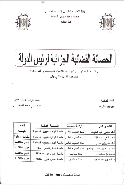 زبيري مارية & مالكي محمد الأخضر (مشرفا ومقررا) (2020). الحصانة القضائية الجزائية لرئيس الدولة (دكتوراه) . قسنطينة.