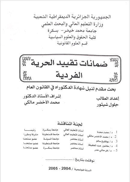 جلول شيتور & مالكي محمد الأخضر (مشرفا ومقررا) (2005). ضمانات تقييد الحرية الفردية (دكتوراه) . بسكرة.