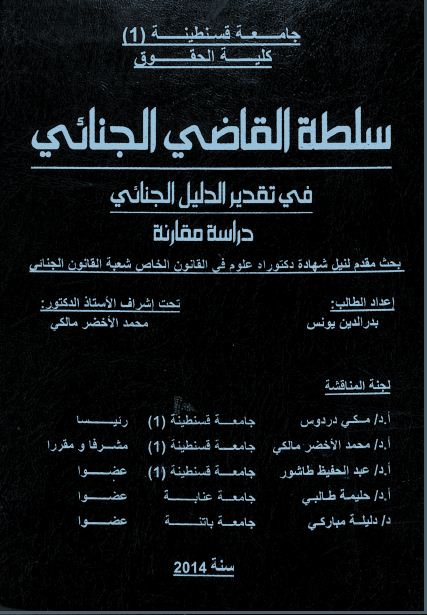 بدر الدين يونس & مالكي محمد الأخضر (مشرفا ومقررا) (2014). سلطة القاضي الجنائي في تقدير الدليل الجنائي (دكتوراه) . قسنطينة.