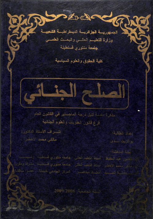 بوالزيت ندى & مالكي محمد الأخضر (مشرفا ومقررا) (2009). الصلح الجنائي (ماجستير) . قسنطينة.