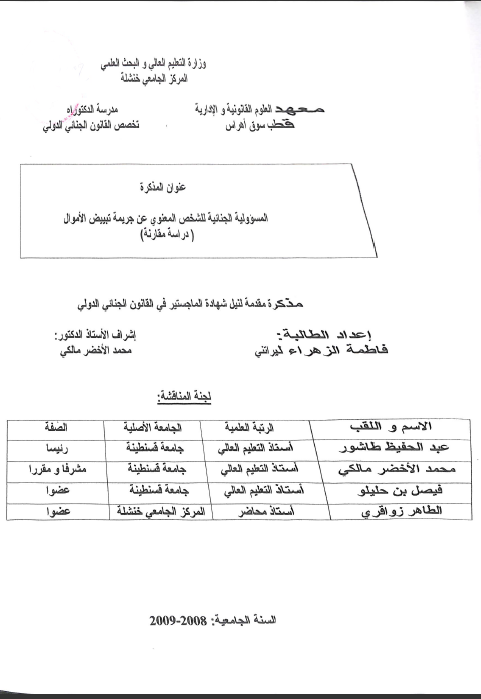 ليراتني فاطمة الزهراء & مالكي محمد الأخضر (مشرفا ومقررا) (2009). المسؤولية الجنائية للشخص المعنوي عن جريمة تبييض الأموال دراسة مقارنة (ماجستير) . خنشلة.