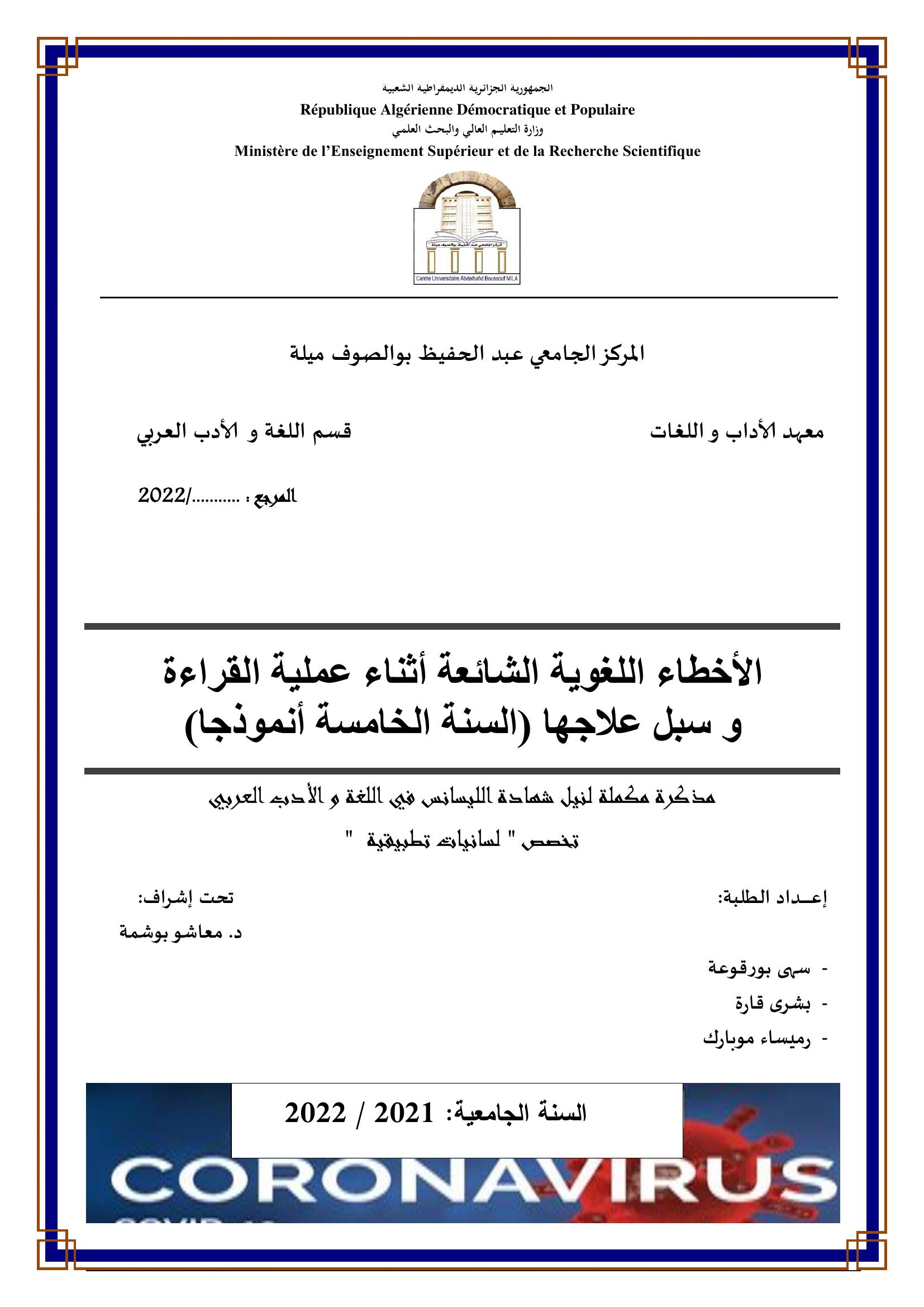 بورقوعة سهى et al. (2022). الأخطاء اللغوية الشائعة أثناء القراءة وسبل علاجها-السنة الخامسة أنموذجا-.