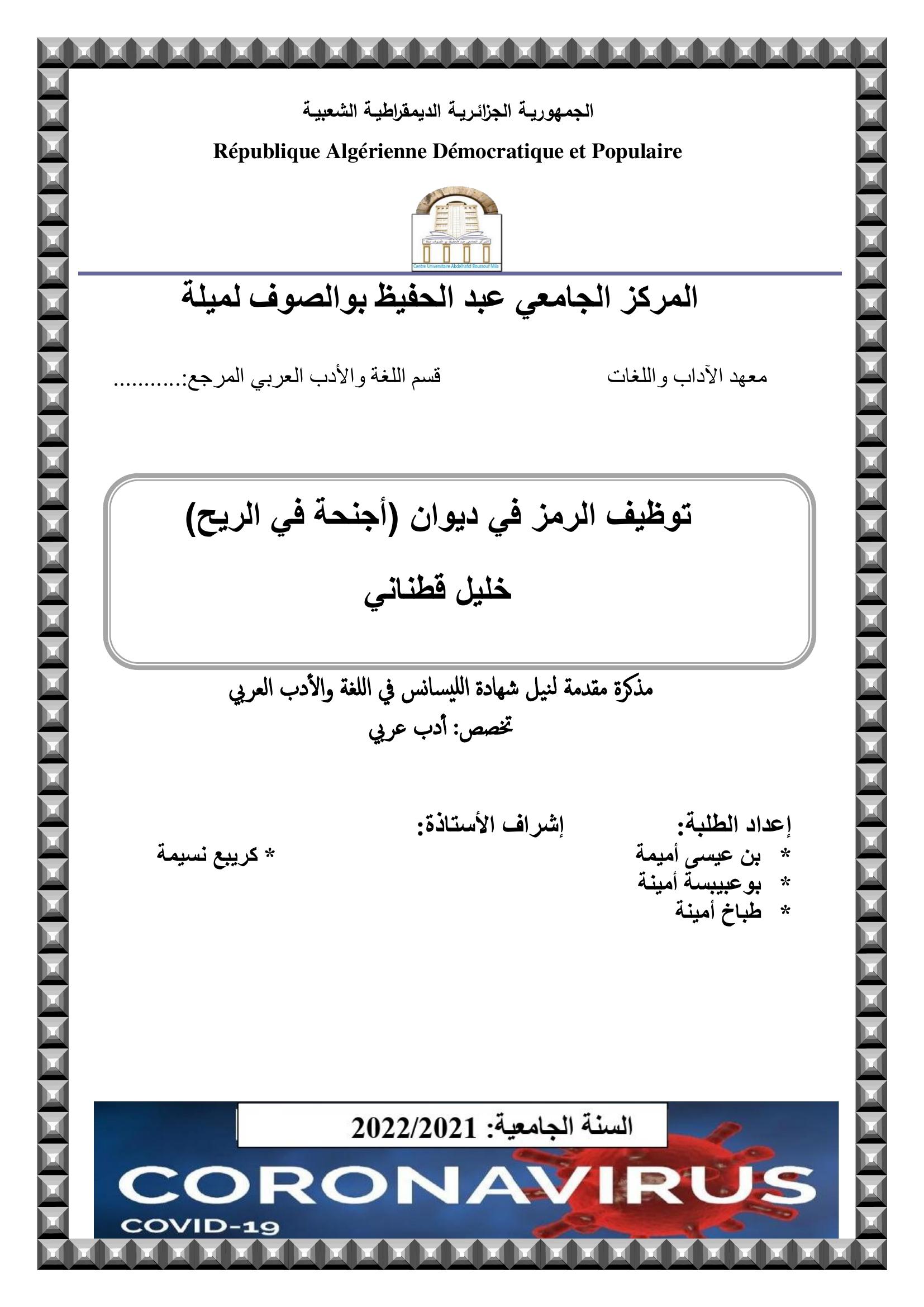 بن عيسى أميمة et al. (2022). توظيف الرمز في ديوان أجنحة في الريح لخليل قطناني.