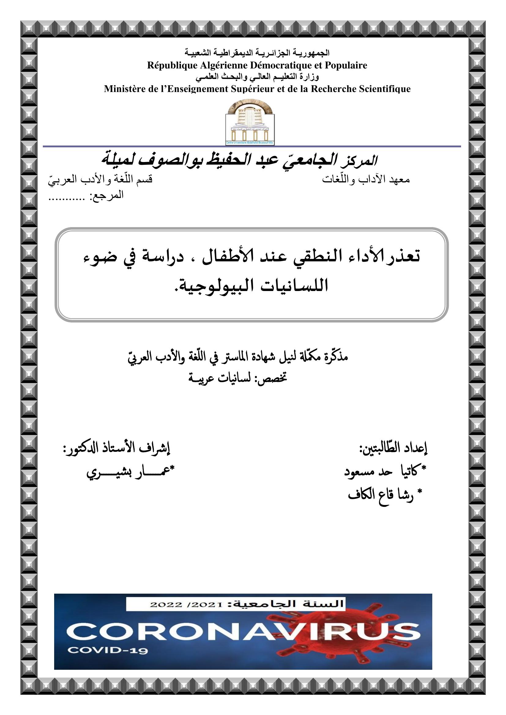 قاع الكاف رشا et al. (2022). تعذر الأداء النطقي عند الأطفال دراسة في ضوء اللسانيات البيولوجية.