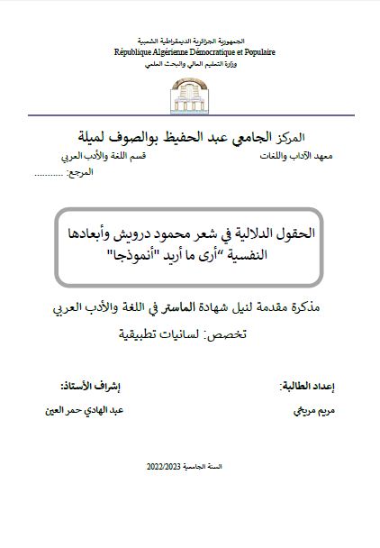 مريخي مريم & حمر العين عبد الهادي (مشرفا) (2023). الحقول الدلالية في شعر محمود درويش وأبعادها النفسية " أرى ما أريد" أنموذجا" (ماستر- ل م د) . المركز الجامعي عبد الحفيظ بوالصوف ميلة.