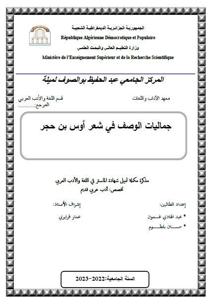 بلطوم حسان et al. (2023). جماليات الوصف في شعر أوس بن حجر (ماستر- ل م د) . المركز الجامعي عبد الحفيظ بوالصوف ميلة.
