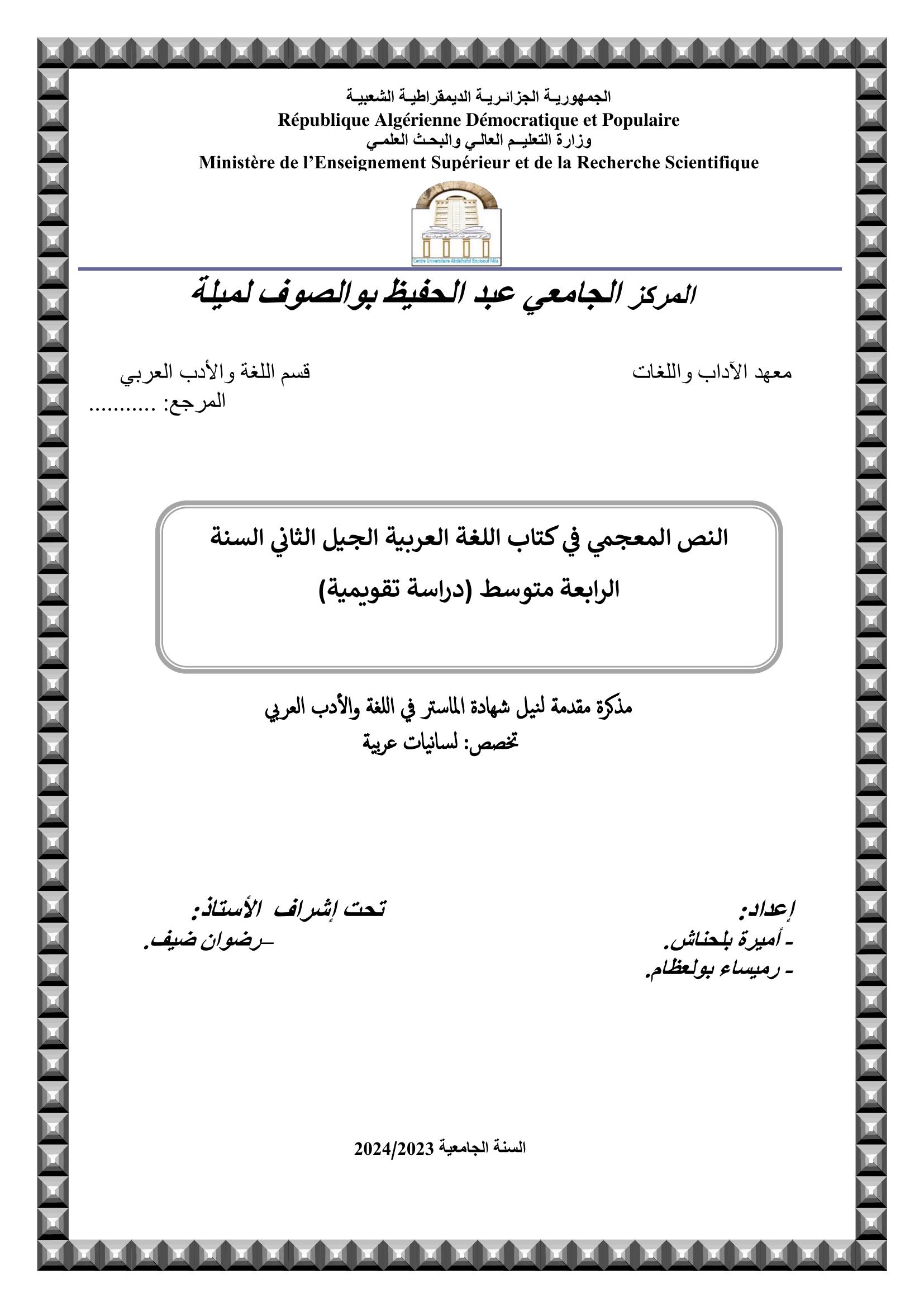 بلحناش أميرة et al. (2024). النص المعجمي في كتاب اللغة العربية الجيل الثاني سنة رابعة متوسط(دراسة تقويمية) (ماستر- ل م د) . المركز الجامعي عبد الحفيظ بوالصوف ميلة.