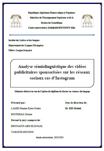 LAMRI Hanine Katre Nadaa et al. (2024). Analyse sémiolinguistique des vidéos publicitaires sponsorisées sur les réseaux sociaux cas d’Instagram (Master-LMD) . Centre universitaire Abdelhafid Boussouf Mila.