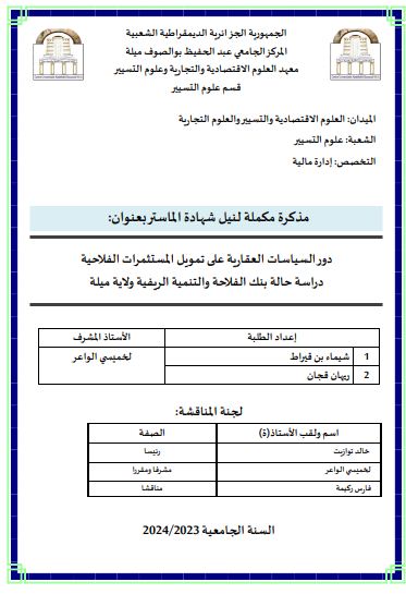 شيماء بن قيراط et al. (2024). دور السياسات العقارية على تمويل المستثمرات الفلاحية: دراسة حالة بنك الفلاحة والتنمية الريفية -ميلة (ماستر- ل م د) .