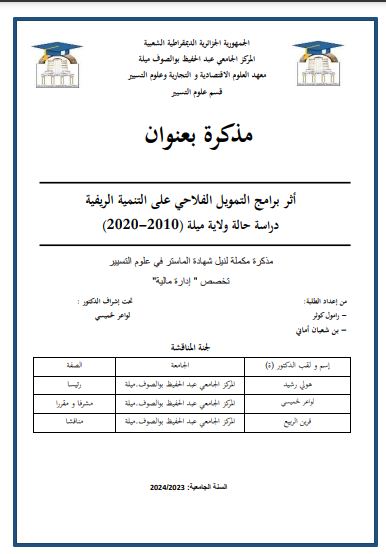 كوثر رامول et al. (2024). أثر برامج التمويل الفلاحي على التنمية الريفية: دراسة حالة ولاية ميلة خلال الفترة 2010-2020 (ماستر- ل م د) .