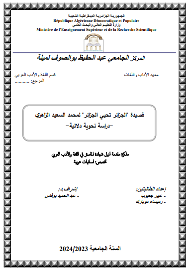 جعبوب عبير et al. (2024). قصيدة " الجزائر تحيي الجزائر" لمحمد السعيد الزاهري دراسة نحوية دلالية (ماستر- ل م د) . المركز الجامعي عبد الحفيظ بوالصوف ميلة.