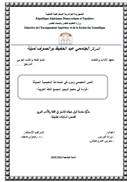 ڨورين ،وردة et al. (2025). النص المعجمي ودوره في الصناعة المعجمية الحديثة – قراءة في معجم الوجيز لمجمع اللغة العربية- (ماستر- ل م د) . مذكرة لنيل شهادة الماستر في اللغة و الأدب العربي.
