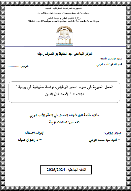اكوهي،فقيه سيد محمد & ضيف رضوان (مشرفا) (2025). الجمل الخبرية في ضوء النحو الوظيفي دراسة تطبيقية في رواية دانشمند لأحمد فال الدين (ماستر- ل م د) . المركز الجامعي عبد الحفيظ بوالصوف ميلة.