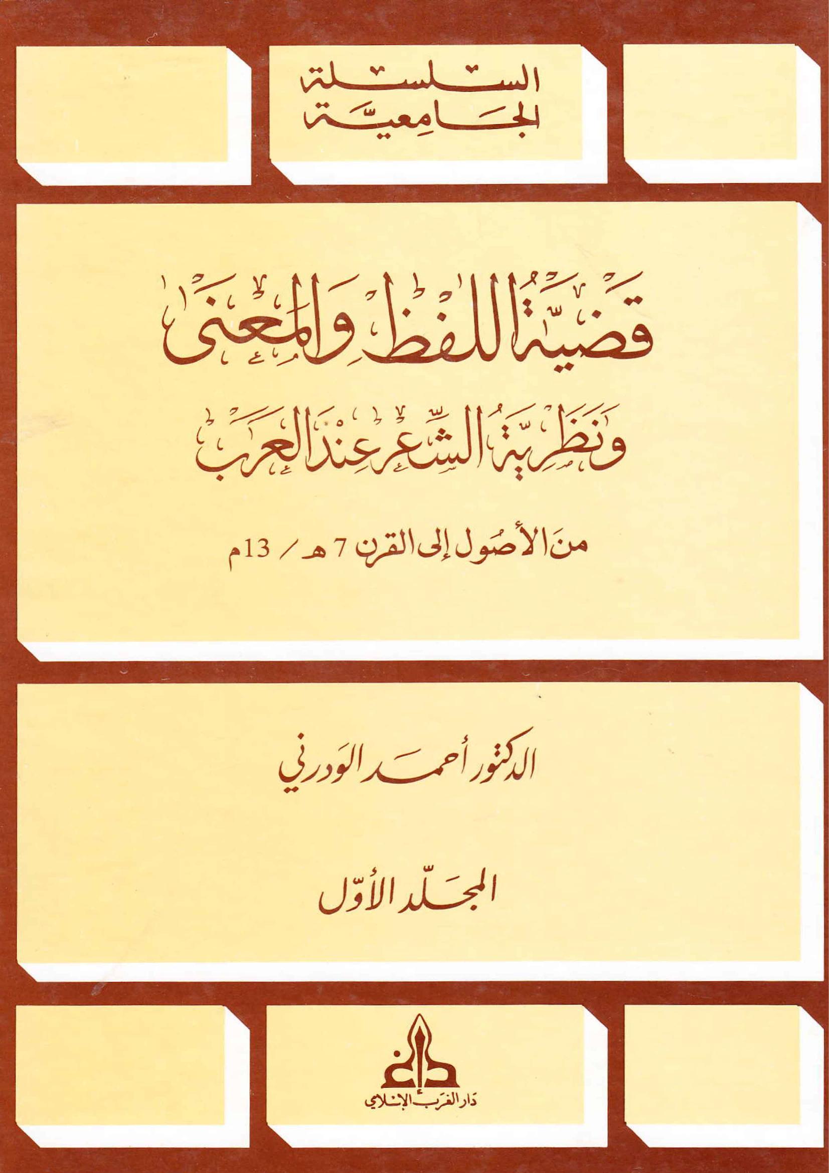 د أحمد الودرني (2004). قضية اللفظ والمعني ونظرية الشعر عند العرب (ط.1) . دار الغرب الإسلامي;