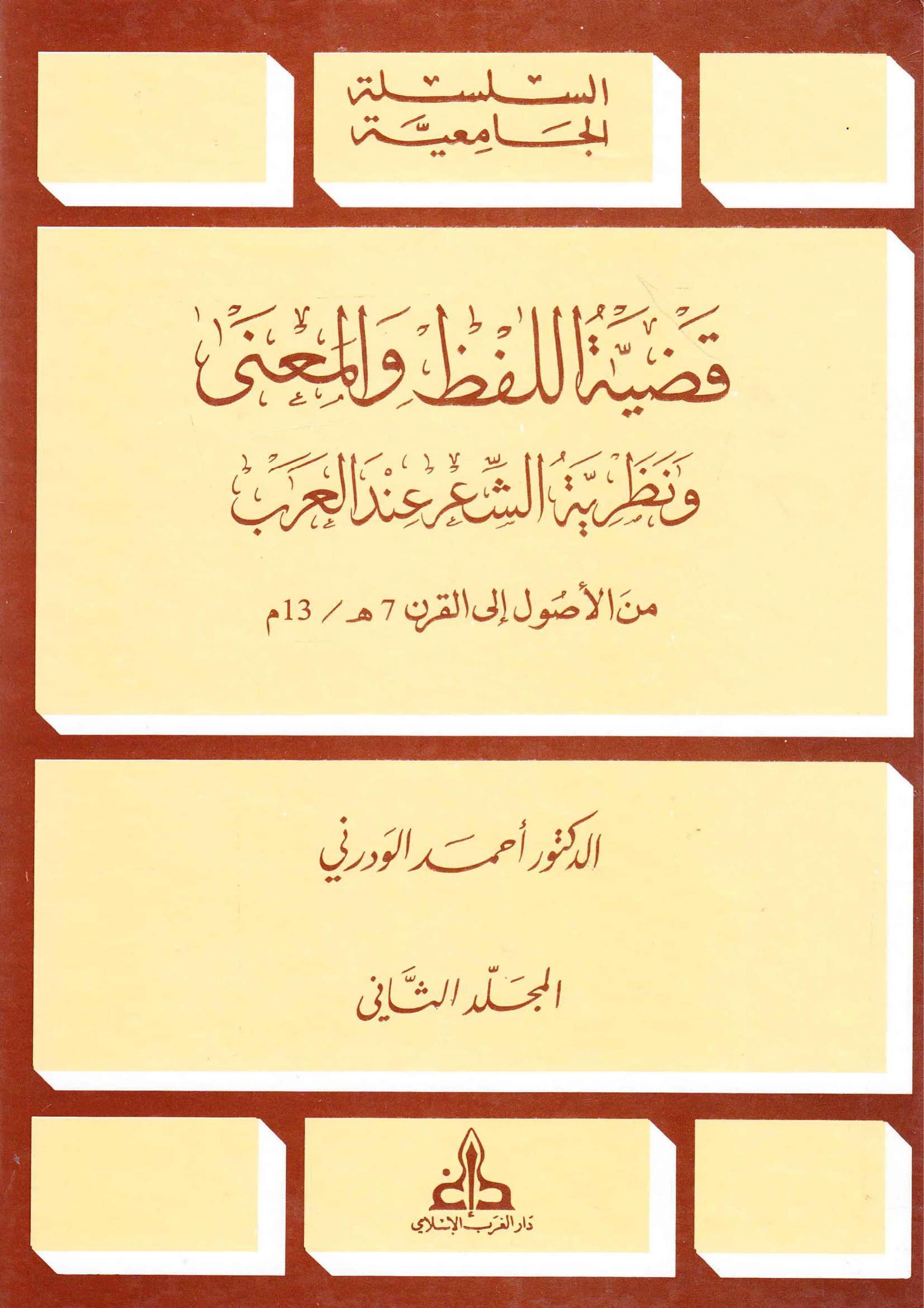 د أحمد الودرني (2004). قضية اللفظ والمعنى ونظرية الشعر عند العرب (ط.1) . دار الغرب الإسلامي;
