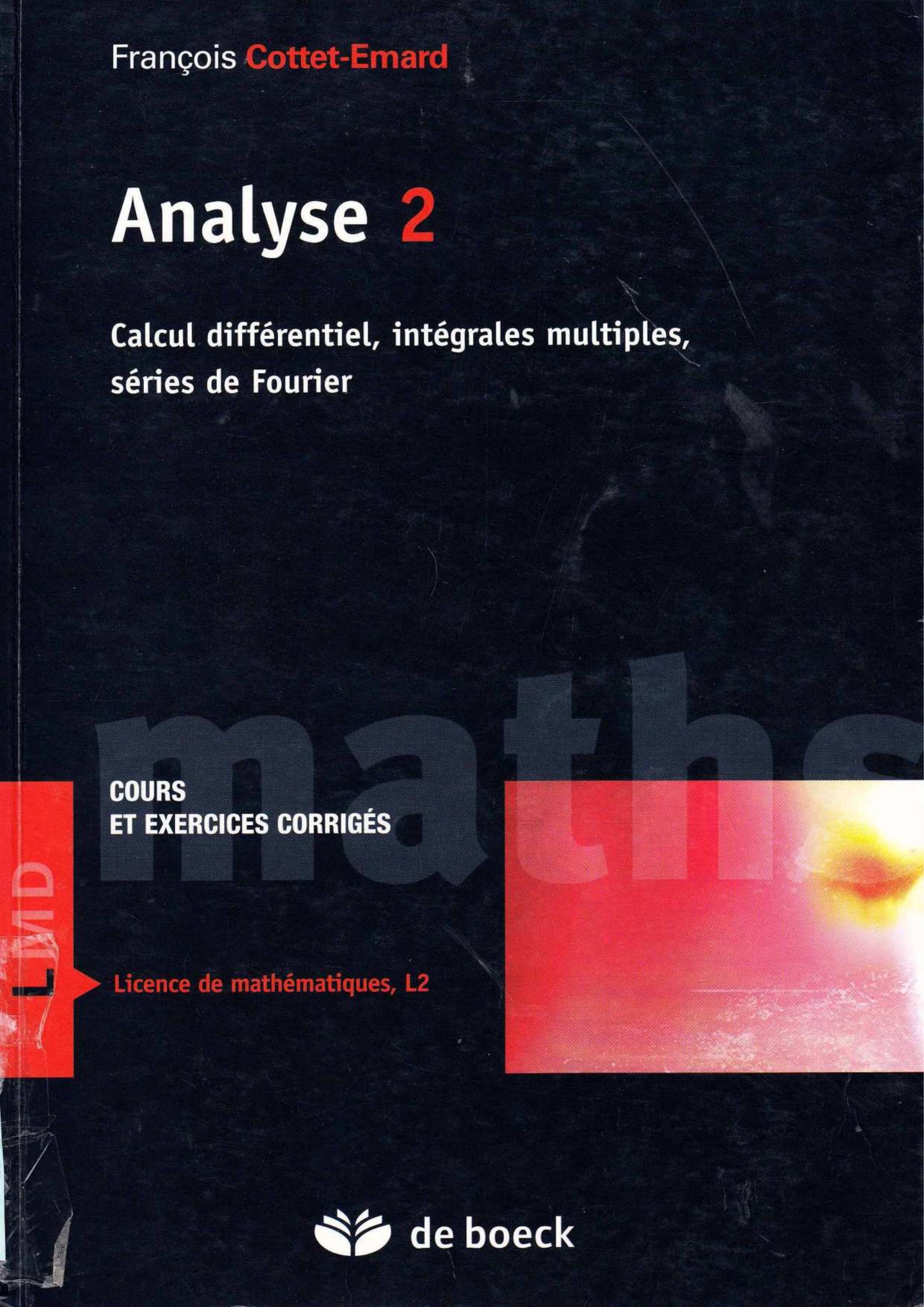 " Un cours vivant, avec de nombreux exemples et de très nombreux exercices corrigés, sans concession à la rigueur mais rendant claires des notions réputées difficiles. " Ce volume complète le cours d'analyse (Analyse, paru aux éditions De Boeck). Il contient le calcul différentiel enseigné dans l'année L2 de licence de mathématiques (fondions de plusieurs variables, intégrales multiples et séries de Fourier). Une connaissance poussée de la topologie n'est pas nécessaire pour aborder ce cours et l'étude en dimension finie ne fait pas appel à des résultats compliqués dans ce domaine. Les délicates techniques de changement de variables sont présentées sous trois aspects possibles, et le lecteur peut faire son choix dans le niveau d'abstraction qu'il souhaite retenir. Les équations aux dérivées partielles offrent une intéressante illustration du calcul différentiel et des séries trigonométriques. Les séries de Fourier sont étudiées sous l'aspect pragmatique des séries réelles, mais les séries d'exponentielles complexes sont aussi présentes. La présentation géométrique des intégrales doubles et des théorèmes permettant leurs calculs permet de comprendre et de retenir facilement ces résultats. Le livre contient environ 4o % d'exercices soigneusement corrigés, permettant au lecteur de s'assurer de sa bonne assimilation. Des exercices d'applications pratiques montrent comment la théorie s'applique à des problèmes concrets. Les " plus " : 6o % de cours et 4o % d'exercices soigneusement corrigés ; Très nombreux exemples illustrant chaque notion nouvelle ; Style souple, proche du cours donné oralement.