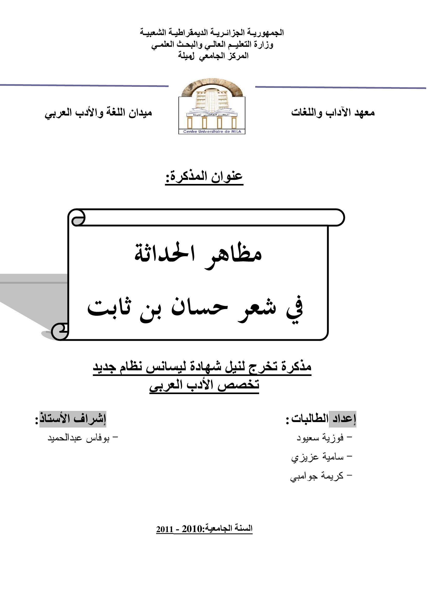 فوزية سعيود & بوفاس عبد الحميد(مشرفا) (2011). مظاهر الحداثة في شعر حسان بن ثابت.