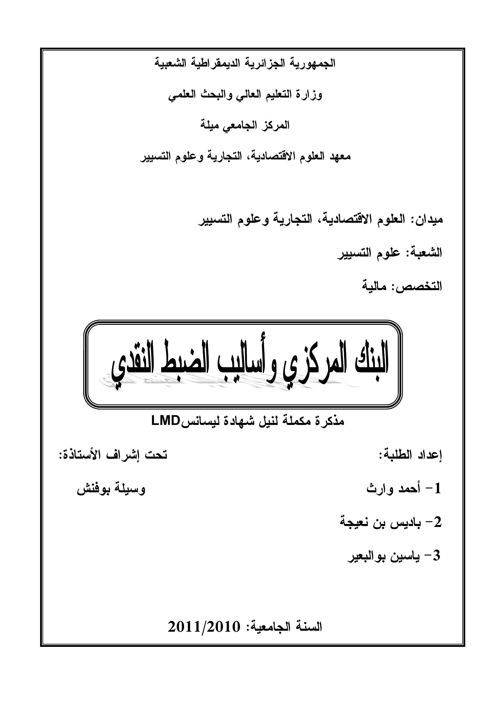 أحمد وارث & وسيلة بوفنش(مشرفا) (2011). البنك المركزي و أساليب الضبط النقدي.