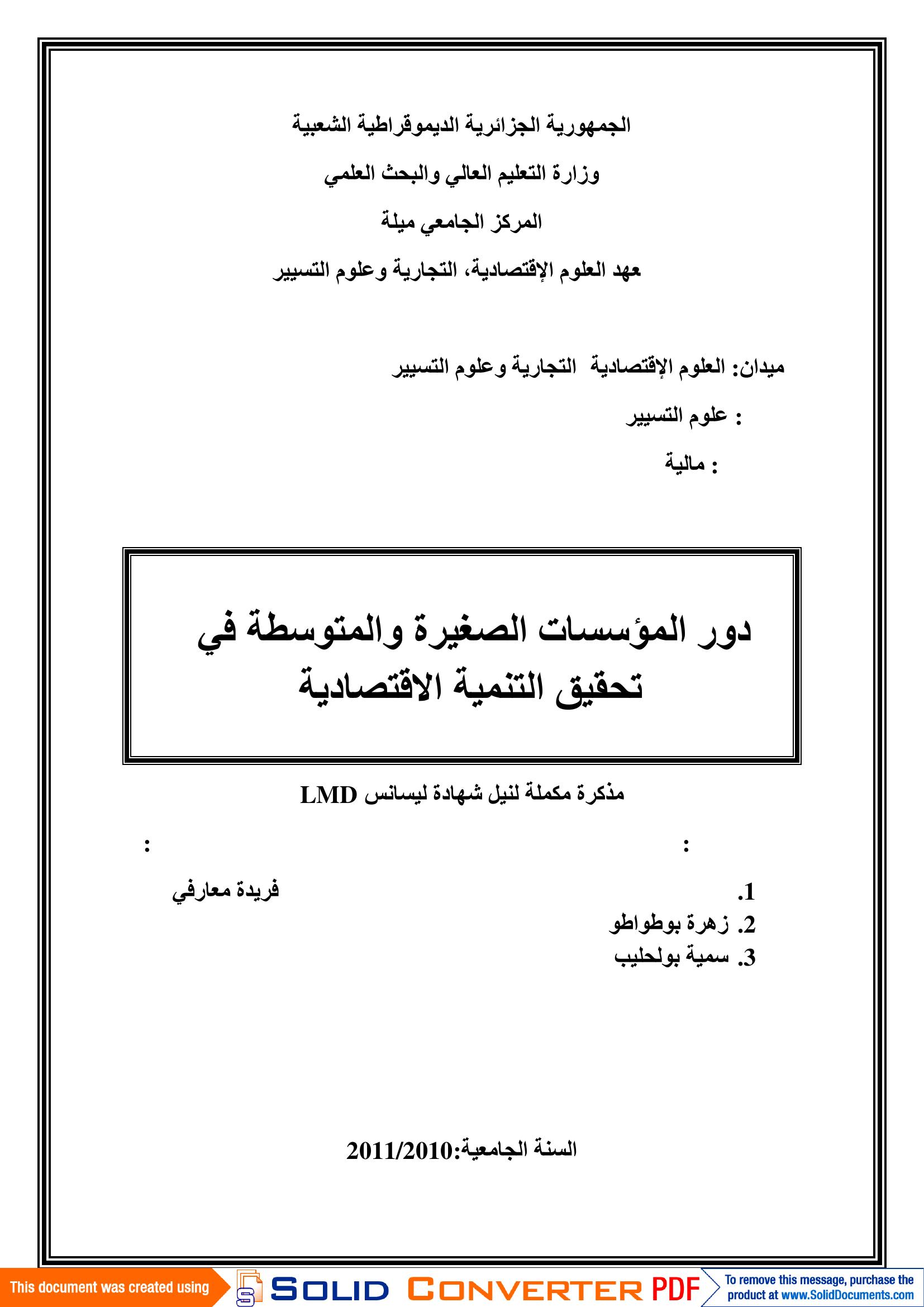 أحلام بشلم & فريدة معارفي(مشرفا) (2011). دورالمؤسسات الصغيرة والمتوسطة في تحقيق التنمية الإقتصادية.