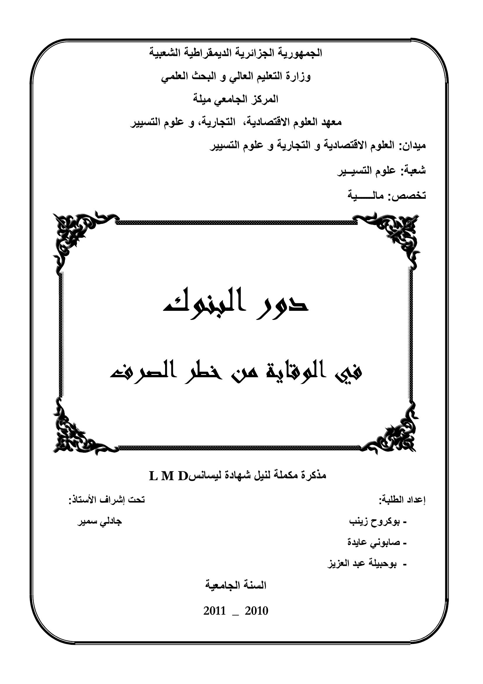 بوكروح زينب & جادلي سمير(مشرفا) (2011). دور البنوك في الوقاية من خطر الصرف.