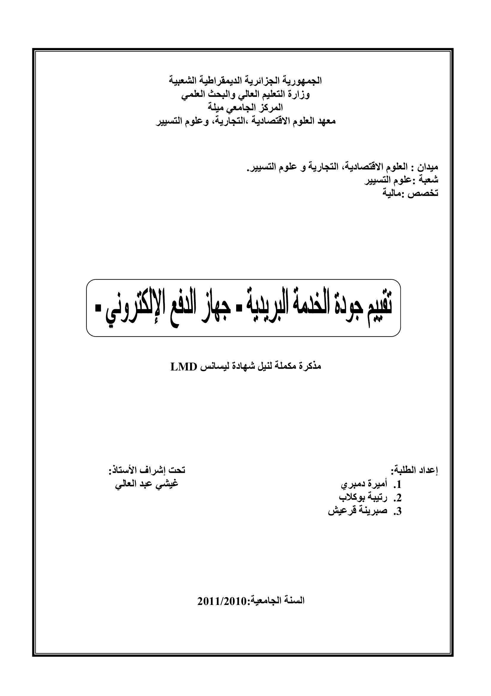 أميرة دمبري & غيشي عبد العالي(مشرفا) (2011). تقييم جودة الخدمة البريدية-جهاز الدفع الإلكتروني-.