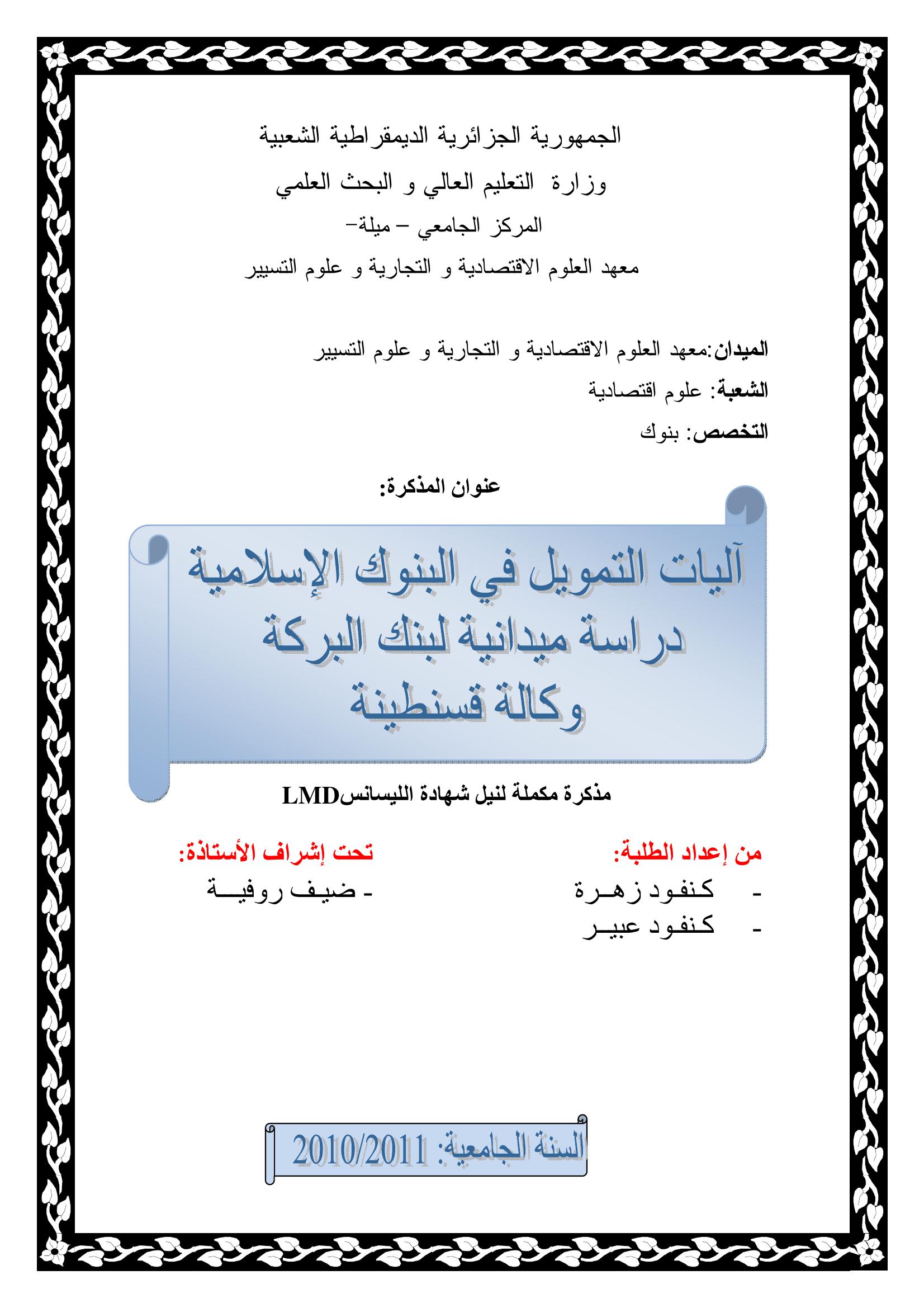 آليات التمويل في البنوك الإسلامية دراسة ميدانية في بنك البركة -وكالة قسنطينة-